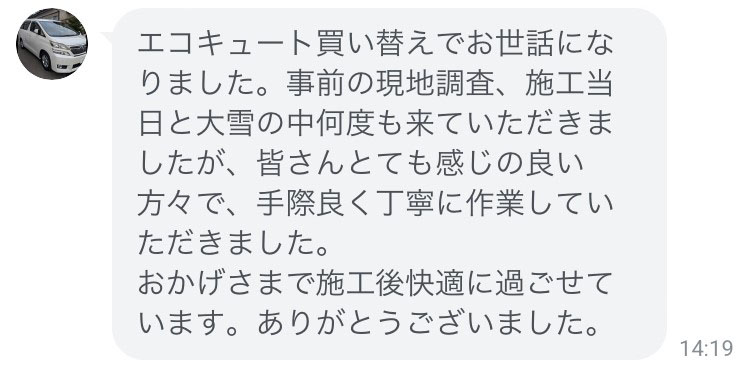 ★★★★★電気温水器からエコキュートへの交換をお願いしました。工事も1日で終了し、その日の夜には入浴できました。リモコン操作で浴槽にお湯張りしたところ、なんと15分で42℃の給湯が完了した。設置後の点検訪問もしていただき、安心できました。工事金額も他社の半額に近い格安料金で、電力料金も1万円/月程度の節約となり本当に感謝しています。