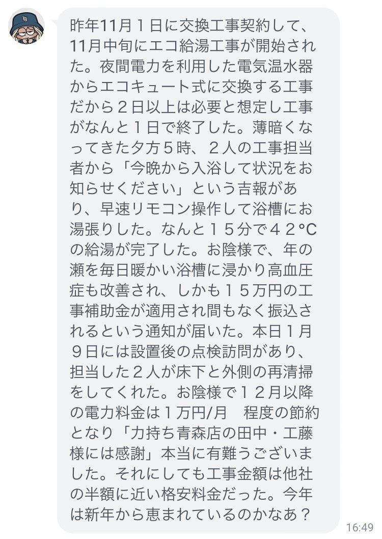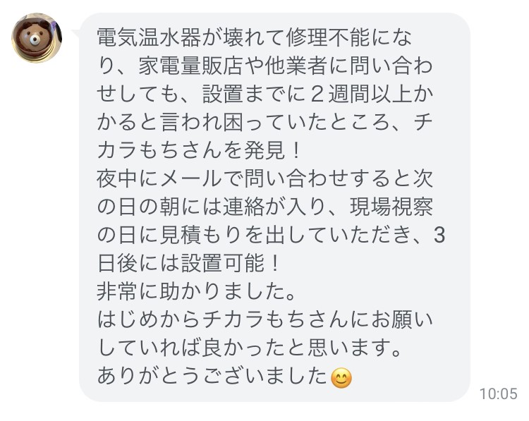 ★★★★★金額も大手よりかなり安く、なにより担当の田中さんと工藤さんの一生懸命な対応に感動しました。お湯もその日のうちに使えるようになり、勢いのよいシャワーを使うことができました。ありがとうございます!お湯もその日のうちに使えるようになり、勢いのよいシャワーを使うことができました。ありがとうございます!