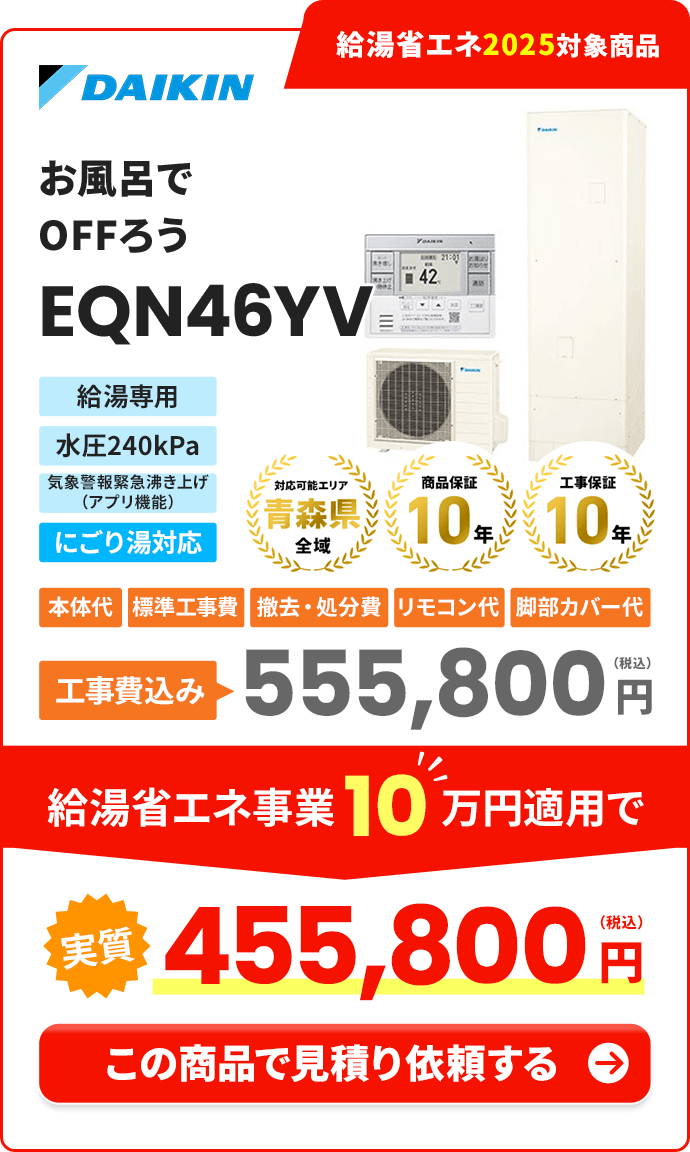 エコキュートの交換取付工事は、チカラもち青森店へ。青森県全域を対応エリアとしています。突然お湯が出なくなった給湯器やエコキュートを見てほしいなどの故障修理のご相談はすぐにお電話ください。ご相談やお見積りは無料で承っております。